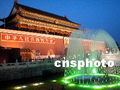北京市政府有關(guān)部門26日透露,為了迎接全國(guó)“兩會(huì)”召開,從2003年3月2日至3月19日,北京全市范圍內(nèi)按重大節(jié)日要求開放夜景照明設(shè)施,開燈時(shí)間為每天18時(shí)30分至23時(shí)。圖為天安門夜景。郎從柳 攝