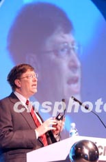 二月二十七日,微軟公司董事長比爾·蓋茨在北京微軟合作伙伴解決方案日上作專題演講。作者:趙振清