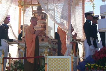 今天早上,泰國曼谷空軍機場舉行了隆重的送歸儀式。泰國文化部長烏萊婉致詞,她以泰國政府、佛教界和全國人民的名義,衷心感謝中國政府為慶祝泰國國王陛下75圣壽大吉,同意佛牙舍利自2002年12月15日至2003年2月28日共76天,赴泰佛統(tǒng)府佛教城臨時供奉76天。她說,供奉期間,泰國人民前往佛教城舉行各種各樣的參拜活動。泰國王儲殿下于1月9日代表國王陛下前往參拜,泰國佛教最高領袖僧王兩次參拜,泰國樞密院主席、國會主席、上議院主席、內閣主要領導人以及眾多議員都前往參拜。在佛牙舍利臨時赴泰供奉事宜圓滿成功之際,泰國政府對中國政府和人民以及中國佛教協(xié)會表示衷心的感謝,并祝愿泰中友好萬古長青。