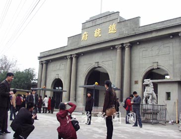 在門樓前,一九五八年被大煉鋼鐵融化的鐵門,現(xiàn)按照一九二九年“總統(tǒng)府”的照片,經(jīng)電子技術(shù)復(fù)原,四十五年后又重新恢復(fù)了原樣。東西兩座邊門共四扇,每扇鐵門的重量都超過一點(diǎn)五噸,而中間的大門每扇就近三噸。門樓上方的"總統(tǒng)府"三個(gè)閃著金光的大字,也是事隔五十八年后,去年十一月二十日才重新放上去的。
