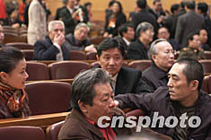 十屆政協(xié)一次會(huì)議三日在北京人民大會(huì)堂舉行開(kāi)幕儀式,全國(guó)政協(xié)委員、著名的歌唱家宋祖英和著名導(dǎo)演張藝謀在開(kāi)幕式前相談甚歡。作者:廖文靜