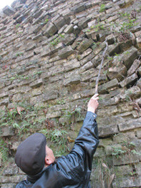 據(jù)對(duì)異常量級(jí)、形式等多種因素比較,在C測(cè)網(wǎng)中還出現(xiàn)了含有磚質(zhì)材料的特征,但在A、B測(cè)網(wǎng)則很難看出有磚質(zhì)材料的特征。按C測(cè)網(wǎng)給出的異常位置,經(jīng)地表調(diào)查,在相應(yīng)的寶城城墻上可看到兩處明顯的張性破裂的裂口和下沉錯(cuò)位,由此推測(cè)這里很可能就是隧道狀構(gòu)筑物即地下宮殿的入口之一。