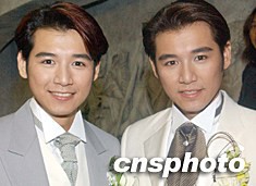 來自臺灣的組合TOPTWINZ(陳騰龍、陳躍虎兄弟)三月四日在香港“現(xiàn)代經典”影樓與香港藝員朱茵一起拍攝主題為“花團錦簇”的婚紗晚裝作品。錢興強 攝