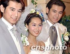 香港藝員朱茵三月四日與來自臺灣的組合TOPTWINZ(騰龍、躍虎)在香港“現(xiàn)代經典”影樓拍攝主題為“花團錦簇”的婚紗晚裝作品。錢興強 攝