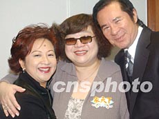 香港藝員沈殿霞三月五日接受香港新城電臺“家天下”訪問。圖為沈殿霞與主持人薛家燕(左)、該臺總監(jiān)甘國亮(右)興高采烈一起拍照。中新社傳真 錢興強 攝