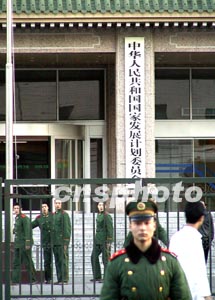 備受各界關(guān)注的國務(wù)院機構(gòu)改革方案六日上午提請十屆全國人大一次會議審議。根據(jù)這一方案,國家發(fā)展計劃委員會將改組為國家發(fā)展和改革委員會,以完善宏觀調(diào)控體系。圖為武警戰(zhàn)士三月在國家計委前執(zhí)勤。作者:羅杰