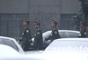 三月六日清晨北京瑞雪紛飛,在全國人大十屆一次會(huì)議駐地的軍警冒雪巡邏。作者:賈國榮