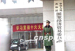 十屆全國人大一次會議七日舉行代表團全體會議,審議國務院機構改革方案。根據(jù)這一方案,中國將組建商務部,以推進流通管理體制改革,國家經濟貿易委員會和對外貿易經濟合作部將不再保留。圖為武警三月在經貿委前執(zhí)勤。作者:武仲林