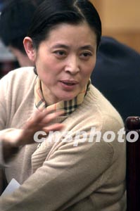 全國政協(xié)委員、電視主持人倪萍在七日的分組討論會上呼吁關(guān)注農(nóng)村普教問題,對貧困山區(qū)發(fā)放“教育券”來保障教育資金的?顚S。作者:廖文靜