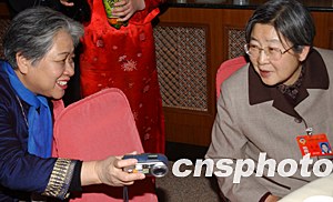 全國(guó)政協(xié)委員韋鈺(左)在政協(xié)慶祝三八婦女節(jié)上和毛澤東的女兒李敏(右)切磋攝影技巧。作者:盛佳鵬