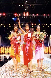 由中國服裝設計師協(xié)會、全國紡織教育學會、石獅市人民政府聯(lián)合主辦,中國職業(yè)時裝模特委員會承辦的“愛登堡”杯第三屆中國職業(yè)時裝模特選拔大賽總決賽,于8日晚上在福建省石獅市體育館隆重進行。經(jīng)過四輪的時裝演繹,最終,來自青島東方麗人模特培訓藝術(shù)學校的戴小奕小姐榮獲冠軍。圖為獲前三名的選手:左起為季軍孫玉琦、冠軍戴小奕、亞軍薛婧。石勇 攝