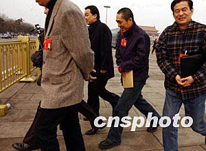 全國政協(xié)影視界的委員們掩護張藝謀將其掩護在中間,三月十三日快步走過天安門廣場,去參加全國政協(xié)的選舉大會。作者:賈國榮