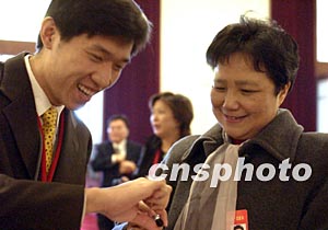 全國政協(xié)十屆一次會(huì)議閉幕大會(huì)十四在京舉行。全國政協(xié)委員、鄧小平之女鄧楠在會(huì)前為工作人員簽名留念。作者:廖文靜