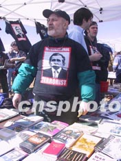 來(lái)自紐約“革命書店”的成員十五日在華盛頓紀(jì)念碑下向集會(huì)反戰(zhàn)的示威者兜售英文版的“毛主席語(yǔ)錄”小冊(cè)子。作者:中新社