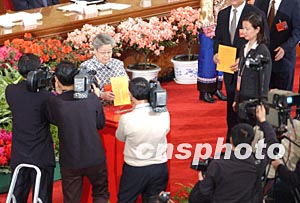 十屆全國人大一次會議第七次全體會議三月十七日在北京人民大會堂舉行,新當(dāng)選的國務(wù)院副總理吳儀參加投票。作者:盛佳鵬