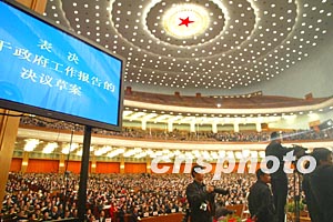 圖:十屆全國(guó)人大一次會(huì)議通過(guò)政府工作報(bào)告等決議草案