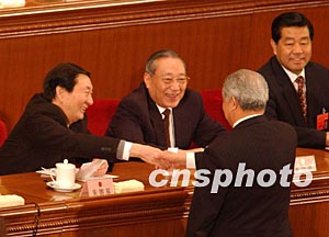 剛剛卸任總理的朱镕基,三月十八日在十屆人大一次會(huì)議閉幕式上,向當(dāng)選副委員長(zhǎng)的盛華仁握手祝賀。作者:賈國(guó)榮