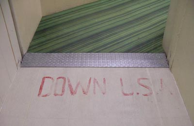 在巴格達(dá)薩達(dá)姆國際機(jī)場,一出機(jī)艙就能看到地上有幾處“打倒美國”的字樣。