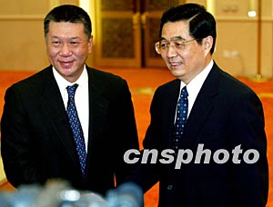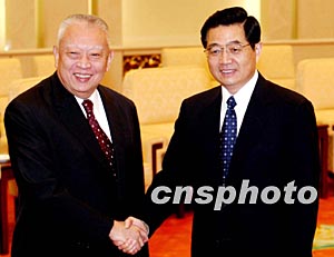 中新社北京三月十九日電(記者黃少華)國家主席胡錦濤今天上午在人民大會(huì)堂福建廳會(huì)見了來北京列席十屆全國人大一次會(huì)議閉幕式的澳門特別行政區(qū)行政長官何厚鏵。
