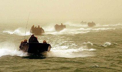 驚天動地的大爆炸之后,英國皇家海軍陸戰(zhàn)隊第3突擊旅和美海軍陸戰(zhàn)隊遠(yuǎn)征小隊的官兵們分乘武裝直升機和汽墊船直向法奧半島的“紅灘”撲去。由于“紅灘”是“肖特-阿拉伯水道”與海灣的戰(zhàn)略接點,所以美英陸戰(zhàn)隊都覺得惡戰(zhàn)難免。然而,讓他們大感意外的是,當(dāng)全幅武裝的美英軍人如狼似虎地?fù)湎驗╊^陣地時,發(fā)現(xiàn)那里根本沒有伊拉克軍人,整個灘頭安靜得讓人不可思議,唯一的活動的目標(biāo)是兩條沖著他們汪汪亂叫的狗,似乎就它們對不速之客的入侵有意見!美國的海豹特種戰(zhàn)部隊為謹(jǐn)慎起見,還是清除了灘頭,把兩只汪汪亂叫的狗趕跑,然后迎接乘坐“支努干”重型運輸直升機和“海王”直升機降落的英軍大部隊。