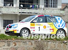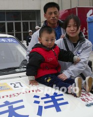 北京慶洋拉力車隊車手陳德安駕駛捷達(dá)GTX賽車,參加2003年中國汽車?yán)惿虾U颈荣。?2日發(fā)車儀式前,特意從北京趕來的妻子與兩歲的兒子前來助陣,期望取得好成績。作者:趙振清