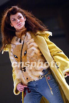 模特二十五日晚在北京舉行的中國(guó)國(guó)際時(shí)裝周上展示做工精美、設(shè)計(jì)獨(dú)特的2003香港新款皮草時(shí)裝。作者:毛建軍