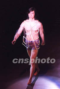三月二十六日,有“今日青年潮流指標(biāo)”之稱的卡賓服飾在北京電影制片廠攝影棚內(nèi)舉行時(shí)尚男裝秀,欲以別致的舞臺效果掀起全新時(shí)尚風(fēng)暴。圖為卡賓演繹透明男裝。作者:武仲林