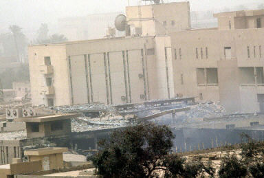 3月26日,美英聯(lián)軍再次轟炸巴格達(dá),伊拉克國家電視臺在空襲中被炸。
