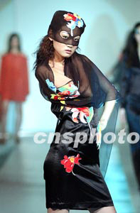 三月二十八日晚,“愛美”時(shí)裝在北京昆侖飯店舉行春夏時(shí)裝流行趨勢發(fā)布會,一名戴面具的模特展示一款性感時(shí)裝。作者:盛佳鵬
