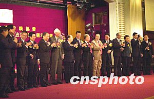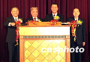 何厚鏵、原全國(guó)人大常委會(huì)副委員長(zhǎng)王漢斌、全國(guó)政協(xié)副主席馬萬祺及中央駐澳聯(lián)絡(luò)辦主任白志健在酒會(huì)為紀(jì)念《澳門基本法》頒布十周年電視特輯首播儀式揭幕。作者:李剛