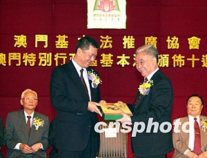 澳門特區(qū)行政長(zhǎng)官何厚鏵在酒會(huì)上向前來出席紀(jì)念活動(dòng)的原全國(guó)人大常委會(huì)副委員長(zhǎng)王漢斌致送紀(jì)念書冊(cè)。作者:李剛