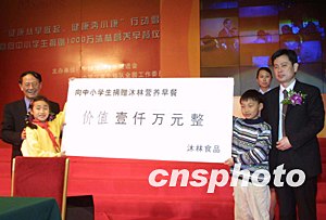 湖南沐林現(xiàn)代食品有限公司董事會主席伍躍時30日在北京人民大會堂通過中國光彩事業(yè)促進會、中國少年先鋒隊全國工作委員會等單位,向中小學生捐贈價值1000萬元人民幣的沐林谷物營養(yǎng)早餐,拉開“健康從早做起,健康奔小康”活動序幕。作者:趙振清