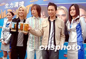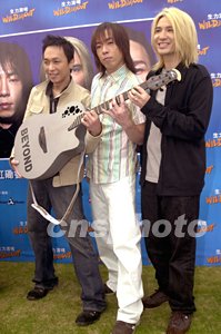 Beyond樂隊三子黃家強、黃貫中、葉世榮(左起)4月4日在香港出席“Beyond超越Beyond Live 03”演唱會記者會,演唱會贊助商于會上向Beyond三子送上“結他”,祝賀Beyond成立二十周年,及希望演唱會成功演出。作者:鄧慶樂
