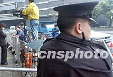 四月七日香港歌迷告別巨星張國榮追悼會(huì)將在香港殯儀館舉行,在殯儀館前警察加強(qiáng)警衛(wèi) 。錢興強(qiáng) 攝