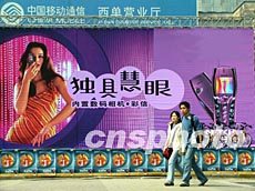 北京西單手機廣場四月新春豎起巨幅外國手機廣告。當前市場競爭激烈,中外廠商為廣告宣傳費盡心機。作者:杜洋