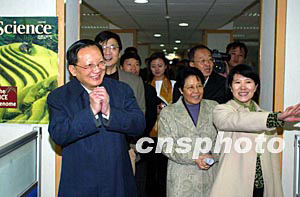 中國新任國務(wù)委員唐家璇十日在國務(wù)院僑辦主任陳玉杰陪同下,到中國新聞社考察指導(dǎo)工作時,向中新社的新聞工作者表示致意。作者:毛建軍