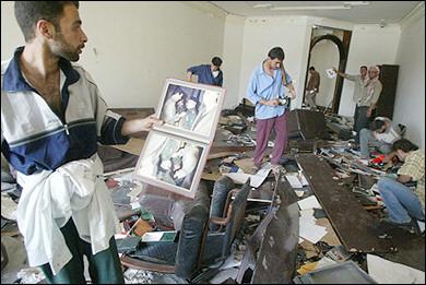 薩達(dá)姆的宮殿被腳手架包圍,毫無疑問在兩周之前,被一枚2000磅的炸彈擊中之前仍然還在建設(shè)之中。散落一地的是那些羅馬風(fēng)格的裸體雕塑,陶瓷獅子雕塑等等。