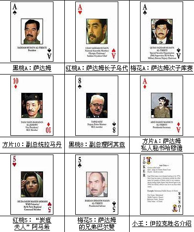 中新網(wǎng)4月12日電 據(jù)法新社報道,美國國務(wù)院當(dāng)?shù)貢r間周五發(fā)出了撲克牌形式的伊拉克高官“通緝令”。媒體報道稱撲克牌共有55張,其中52人為伊拉克官員名單,另外的3張為伊拉克人姓名等相關(guān)問題介紹。這些高官按撲克牌的次序依次列出,其中薩達姆與他的兩個兒子分別被定為黑桃、梅花和紅心A。方片A為薩達姆私人秘書哈穆德。據(jù)悉,撲克牌“通緝令”已經(jīng)發(fā)到美軍官兵手中。