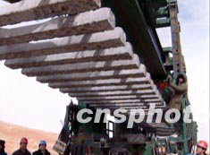 青藏鐵路鋪架工程十三日下午成功跨越地震斷裂帶,抵達(dá)海拔四千七百多米的昆侖山埡口,至此青藏鐵路鋪架已達(dá)一百五十公里。中新社 圖