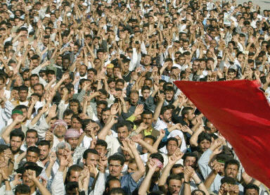 4月14日在伊拉克的南部城市納杰夫,伊拉克的什葉派教徒舉行了大規(guī)模的反戰(zhàn)示威游行。