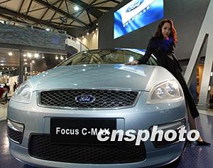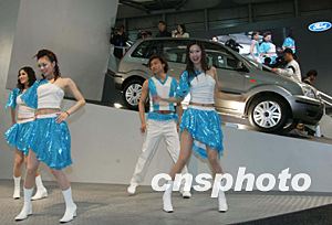 美國福特汽車公司新型跑車在美女的陪伴下十九日亮相即將開幕的第十屆上海國際汽車展覽會(huì)。作者:趙振清