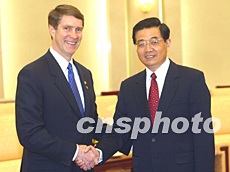 四月二十一日,中國國家主席胡錦濤在人民大會堂會見由參議院多數(shù)黨領(lǐng)袖比爾·弗里斯特率領(lǐng)的美國參議院訪華代表團(tuán)。