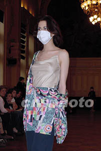四月二十四日在巴黎舉行的一次春夏時裝展上,模特兒們戴上了防“非典”口罩,顯示出另一種生活風情和時尚。作者:蔚中