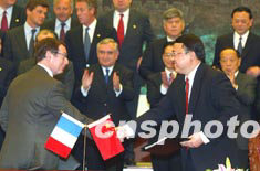 中國國務(wù)院總理溫家寶與法國總理拉法蘭四月二十五日在北京人民大會堂舉行會談,并出席雙方簽署關(guān)于中國購買三十架空中客車飛機的總協(xié)議簽字儀式。作者:毛建軍