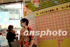 香港一購物商場(chǎng)特設(shè)顧客心意咭,感謝為對(duì)抗非典型肺炎的醫(yī)護(hù)人員。據(jù)醫(yī)管局26日公布,首次有醫(yī)護(hù)人員在照顧SARS病人時(shí)受到感染而殉職。洪少葵 攝