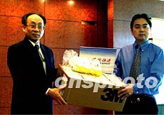 美國(guó)紐約哥倫比亞大學(xué)中國(guó)學(xué)生學(xué)者聯(lián)誼會(huì)購(gòu)買(mǎi)了五千只世界衛(wèi)生組織推薦的N九五防護(hù)口罩,贈(zèng)送給戰(zhàn)斗在抗擊非典型肺炎第一線(xiàn)的中國(guó)醫(yī)務(wù)工作者。二十九日哥大學(xué)生代表將口罩樣品和捐贈(zèng)清單交給中國(guó)駐紐約總領(lǐng)事張宏喜(左)。作者:趙海燕