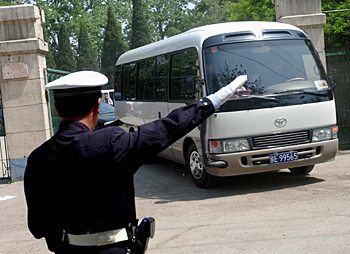 交通警察指揮北京市委書記一行的考察車進(jìn)入醫(yī)院。
