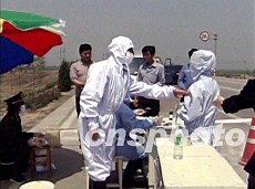 中國交通部五月再令各地迅速采取措施,嚴(yán)防“非典”向農(nóng)村擴(kuò)散。圖為交通部門在路口設(shè)立衛(wèi)生檢查站,對車輛人員進(jìn)行檢查消毒。作者:中新社