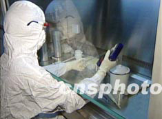 中科院日前加緊科技攻關(guān),盡全力攻克“非典”病毒。目前中科院所屬研究機構(gòu)啟動了對“大環(huán)內(nèi)脂抗生素”、“核甘類”、及“多肽類”三個方面的研究工作,期望在一至兩個月內(nèi)找出抗“非典”的藥物,并致力于對“診斷試劑”和“防治非典疫苗”方面的研究。中新社 圖