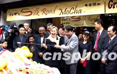 紐約州聯(lián)邦參議員希拉里.·克林頓五日到訪紐約華埠,與社區(qū)人士探討振興華埠議題,澄清“非典”謠言,并按照中國傳統(tǒng)方式為新張的“絲路”咖啡屋剪彩。(希拉里的右邊為咖啡屋老板蔡政存)中新社記者:趙海燕